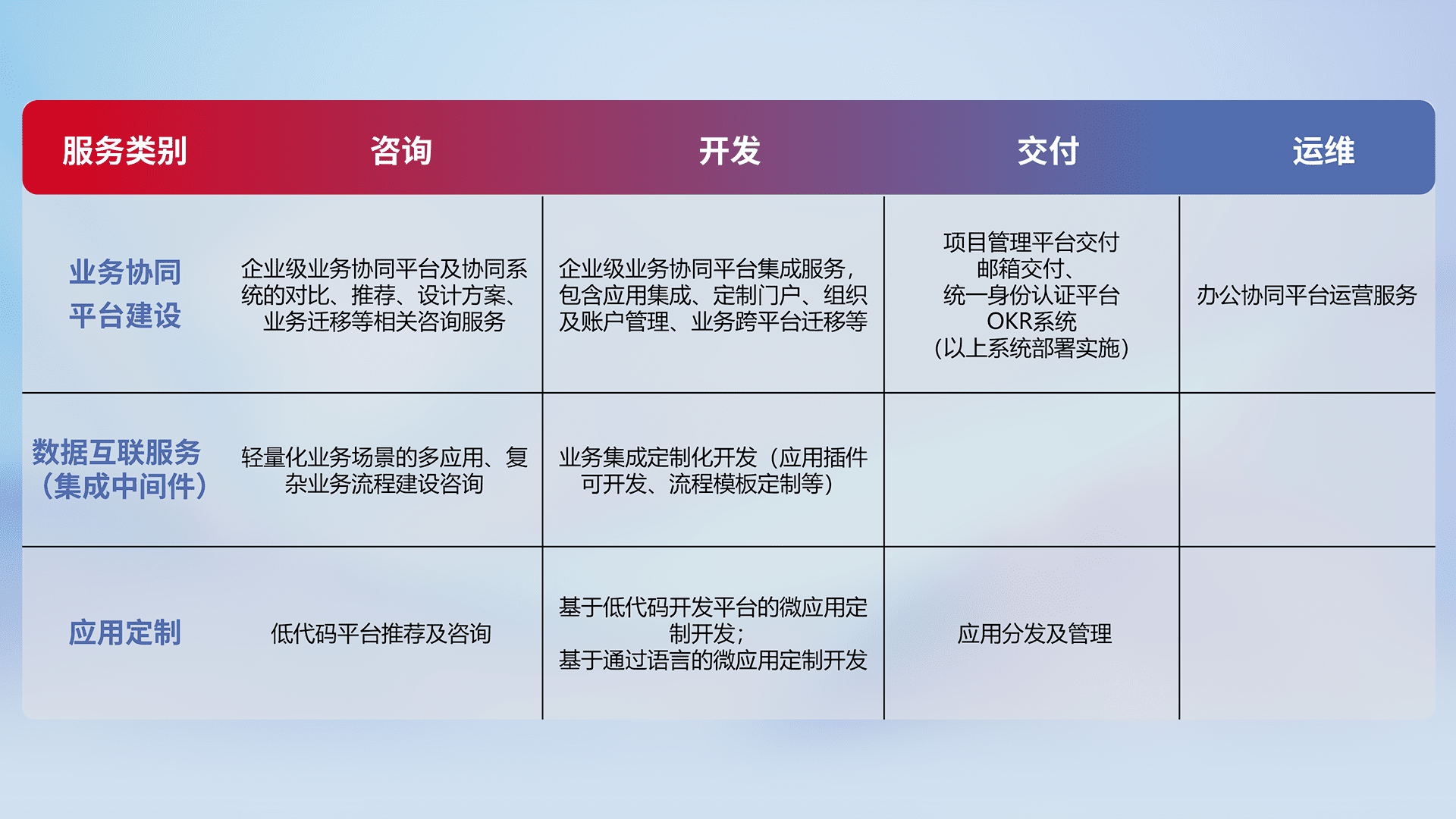 针对钉钉、、、、企微、、IDaas等平台级产品提供产品的规划、、、方案、、、交付、、定制化开发等服务,,实现如统一协同办公、、、智能客户服务、、、、混合会议管理、、、智能数据查询、、、等业务场景,,,实现数字化转型。。